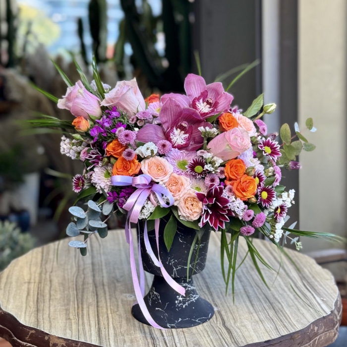 Sevdiklerinize unutulmaz bir sürpriz yapın! Kandilli Çiçek Aranjmanı, zarif lila güller, mor orkide, beyaz krizantemler ve mevsim çiçekleri ile özenle hazırlanmıştır. Siyah mermer desenli lüks vazo içerisinde sunulan bu özel tasarım, romantik anlarınızı taçlandırmak için mükemmel bir seçimdir.