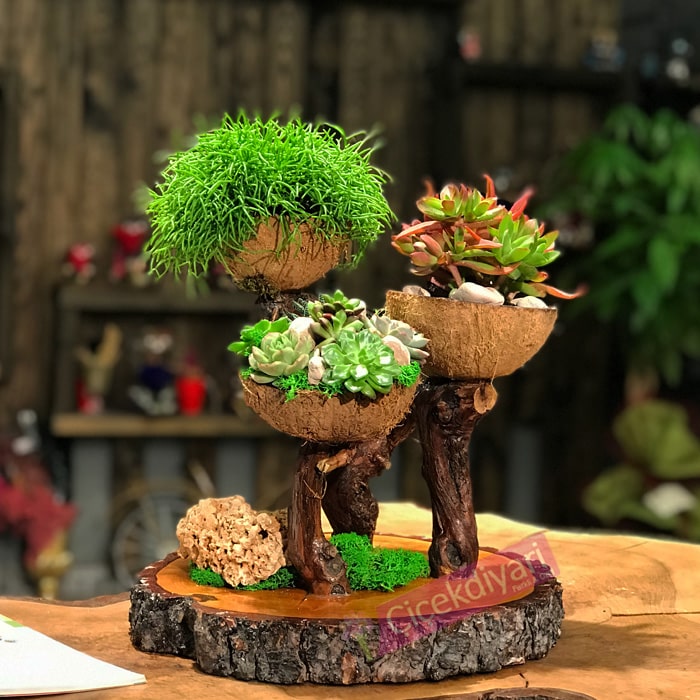 Doğal ağaçlarla hazırlanan özel tasarım objede rhipsalis ve sukkulentlerin crassula-para agacı ile farklı butik tasarımı.