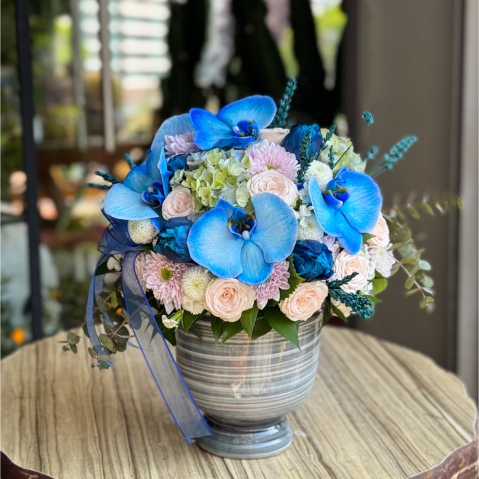 Canlı mavi orkide çiçekleri, pastel tonlarda güller, şık seramik vazo ve zarif yeşil dokunuşlarla hazırlanan bu özel aranjman, sevdiklerinize unutulmaz bir hediye sunuyor. Modern ve zarif görünümüyle hem ev hem de ofis dekorasyonunda fark yaratır. Doğum günü, yıldönümü, tebrik veya özel günlerde duygu dolu bir jest yapmak için ideal bir seçimdir.