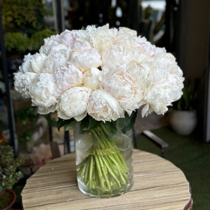 41 beyaz şakayıkla hazırlanmış bu gösterişli sade tasarım, zarafet ve saflığın etkileyici bir temsili. Aşkı, bağlılığı ve iyi dilekleri simgeleyen beyaz şakayıklar; göz alıcı bir sade .